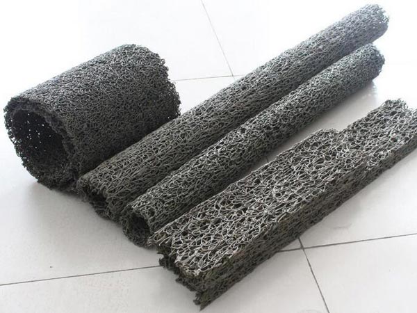 塑料盲溝是由塑料芯體外包裹濾布組式。塑料芯體是以熱可塑性合成樹脂為主要原料,經過改性,在熱熔狀態(tài)下,通過噴咀擠壓出細的塑料絲條,再通過成型裝置將擠出的塑料絲在結點上熔接,形成三維立體網狀結構。